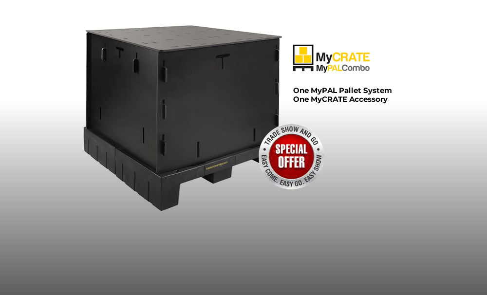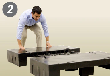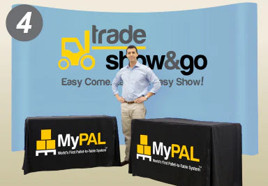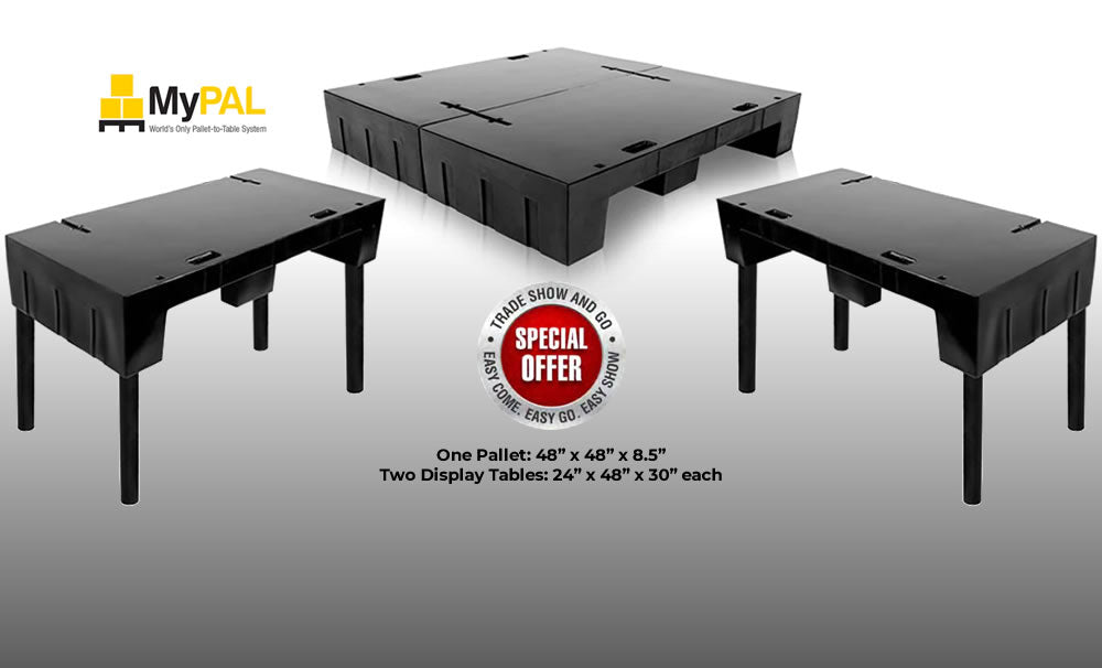 The first standard shipping pallet that becomes two display tables in four EASY steps! No Tools Required!